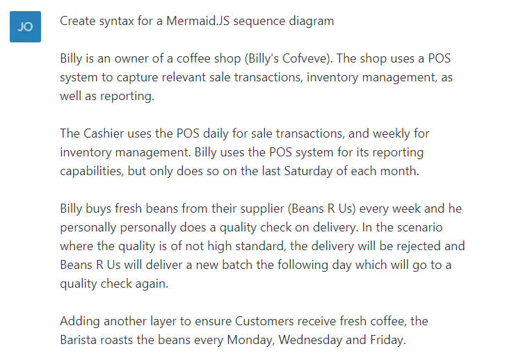 1. To request ChatGPT to output the relevant Mermaid.JS syntax, simply input which diagram you want and provide your own scenario. e.g “Create syntax for a Mermaid.JS sequence diagram” for the following scenario (Enter scenario).