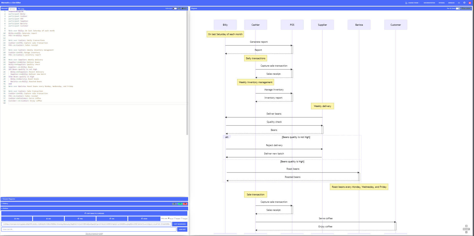 Mermaid.JS is an open-source JavaScript library that enables users to create, edit, and render diagrams by using simple text-based syntax. It can create the following diagrams, however not limited to: