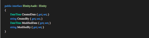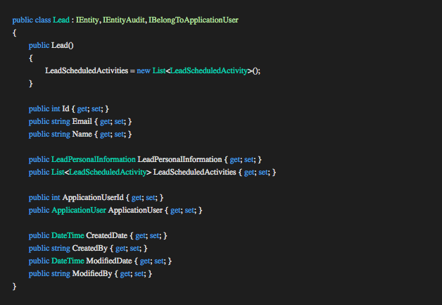 The Lead entity implements the interface IEntityAudit containing fields for basic auditing. When the Create and Update methods on the repository are invoked from the concrete handlers the repository checks if the entity is of type IEntityAudit. If the check passes the repository uses the Application User Context (IApplicationUserContext), constructed in the TokenAuthenticationAttribute mentioned in the controller section, to populate the appropriate fields on behalf of the developer reducing the responsibility of the concrete handlers.