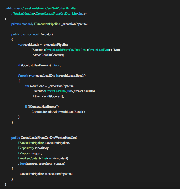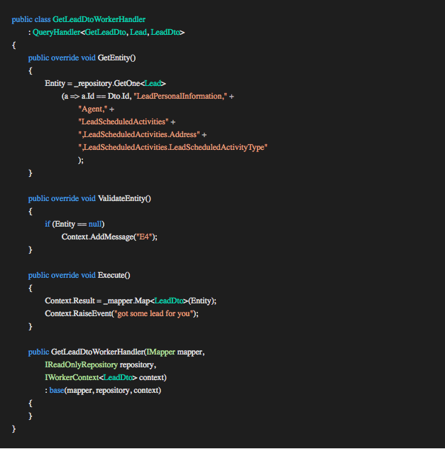 This is where we apply the business logic, conclude the transaction and compose the result TOut (LeadDto). In the GetLeadDtoWorkerHandler example above we map the entity to the type TOut and assign it to the Result property of the Context for the Execution Pipeline to process and pass the result to the controller.