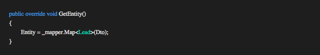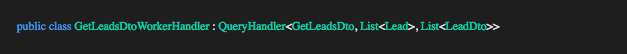 The Command/Query handler excepts the three generic type parameters we are interested in <TRequestDto, TEntity, TOut>. TEntity represents the database entity we are going to query or maintain in the concrete handler. TEntity (Lead) can represent a single entity or list of entities (see the example below).