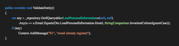 This method isolates any checks we want to do against the database if required. We might want to check the result (the Entity property) from the GetEntity or perhaps check data from the TRequestDto against the database (E.g duplicate email address on registration ). In the example above we return an E4 error code indicating that the requested lead was not found. The Execution Pipeline will stop when the error is raised and pass control back to the controller.