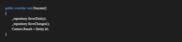 In the case of a command (creating or updating a lead) we will conclude the transaction by calling the appropriate methods on the IRepository interface before we compose the result TOut (see the example below)