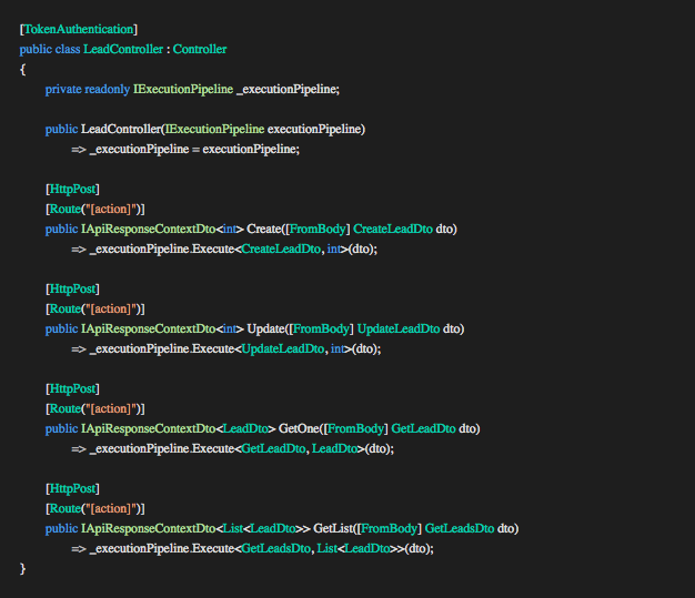 The controller methods are thin to the degree that each method can be implemented using a single line of code. The line of code calls the Execute method on the IExecutionPipeline interface with two generic type parameters and the Request DTO. In the example above the first type parameter is the type of the request DTO (TRequestDto:GetLeadDto), the second type parameter is the type of the result expected back (TOut:LeadDto) and the last parameter is the request DTO passed into the controller method.