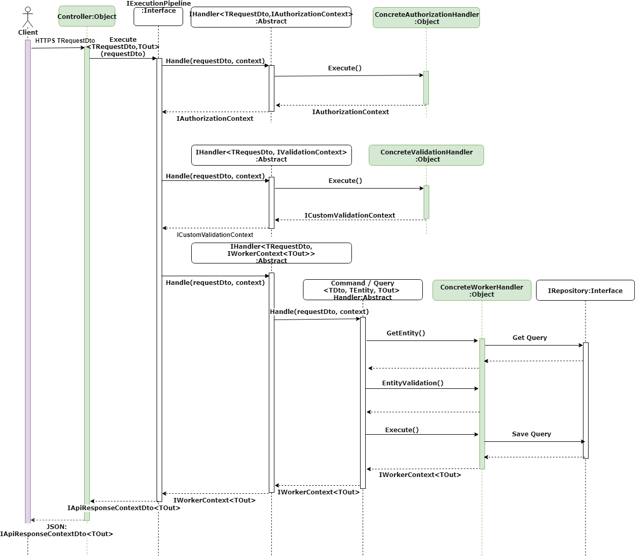 The Execution Pipeline is responsible for controlling the execution of the concrete handles using the IHandler interface and calling into the handlers. This takes the control flow away from the concrete handlers and moves it into the framework