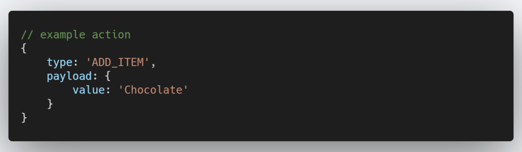 Note: It’s suggested that the type is a string constant and if your app’s scale is increasing, then you move those constants into their own module. This avoids using string literals and potentially having a typo between the type value in your action and then type value we’ll perform a switch on in our reducer. For this demonstration, we’ll just use a string literal for simplicity’s sake.