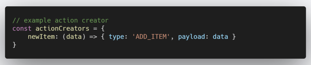 This provides us with an object that has a function property called newItem. If we provide that object with a data value of say “Chocolate”, it’ll produce an action like the one we saw in initial example of an action object.