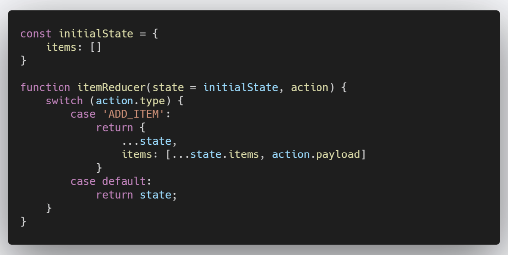 - We’ve created our initialState object that just has a property of items which is an empty array to begin with.