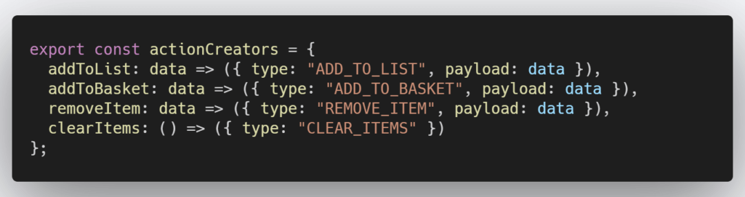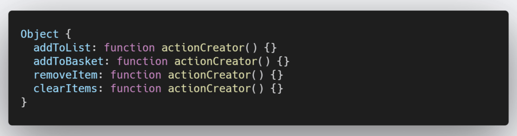 All we need to provide this method is the type of the action (like we normally would) and it’ll implicitly build a function that would take data and return that as a payload. The result of the above could would provide is with an actionCreators object that if we were to log, would look like this: