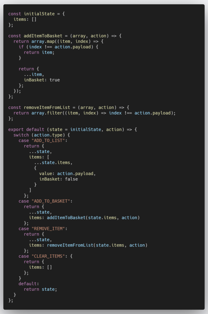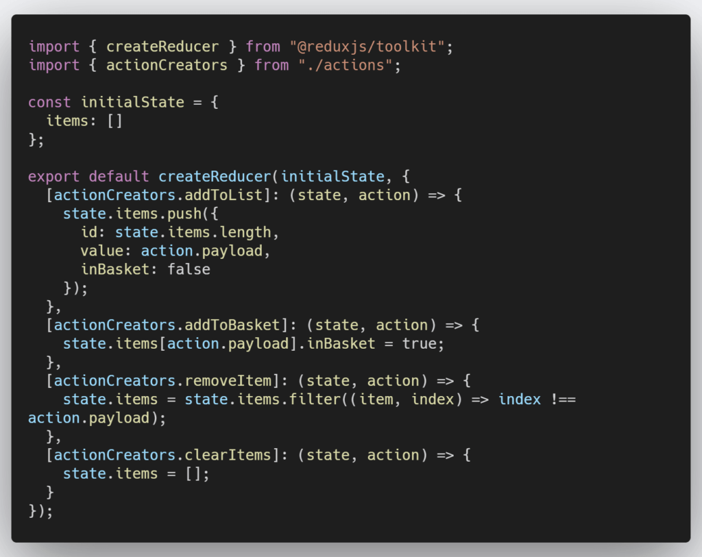 After importing the new library using npm i reduxjs/toolkit, we could make use of the createReducer function. This function allows us to build a reducer without having to have a switch cache (and thusly mitigating the need for string constants for action types everywhere). The biggest bonus is that this library is a wrapper for immer which means it allows us to make changes mutably.
